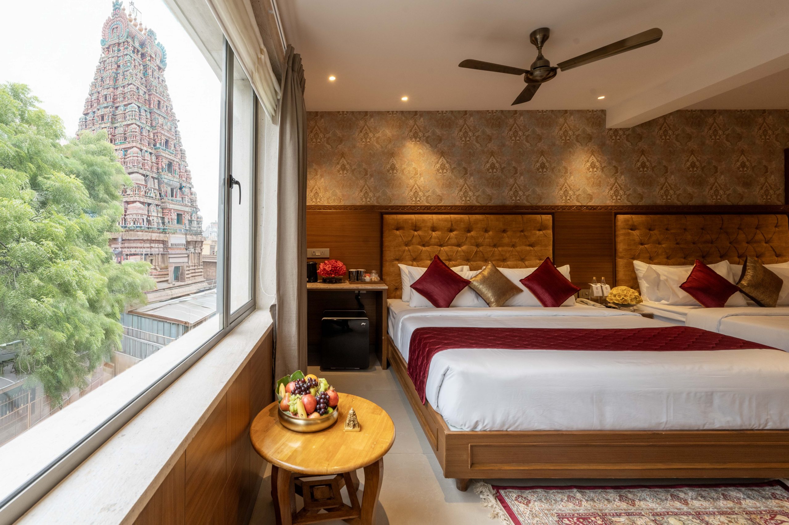 Step into the Maharaja Suite, where royal heritage is reimagined with modern sophistication. Each artistic detail enhances its serene grandeur, creating an ambience that reflects the sacred energy and enduring soul of Madurai.